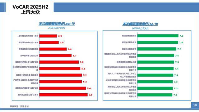 具體指標分析,新車盈利的滿意度和信心度得分最低,盈利能力模塊指標在“本次調(diào)研指標得分Last10”中占了八席。與之相反,經(jīng)銷商人員管理、廠家人員的工作能力及支持獲得了經(jīng)銷商較高的認可。