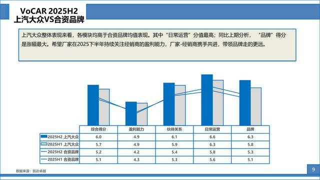 綜合得分來看,上汽大眾2025H2綜合得分6.0分,環(huán)比提升了0.3分,除“盈利能力”模塊得分保持穩(wěn)定外,其他三大模塊得分均有不同幅度上漲。今年上半年,廠家找到了“銷量”與“盈利”之間的平衡點,帶領上汽大眾經(jīng)銷商穩(wěn)步向前,并且通過新能源車的進一步加持,繼續(xù)走在行業(yè)前列,帶領經(jīng)銷商走出當前“以價換量”困境。