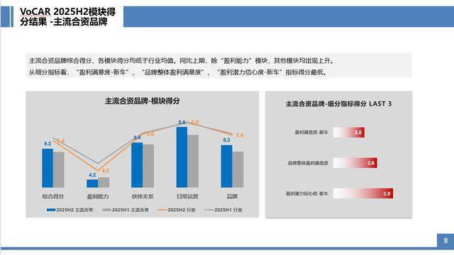 報告顯示,2025H2主流合資品牌受終端價格戰(zhàn)、庫存壓力、盈利模式轉(zhuǎn)型等多重因素疊加影響,整體表現(xiàn)弱于行業(yè)均值——綜合得分5.2分,低于全行業(yè)5.4分的平均水平。