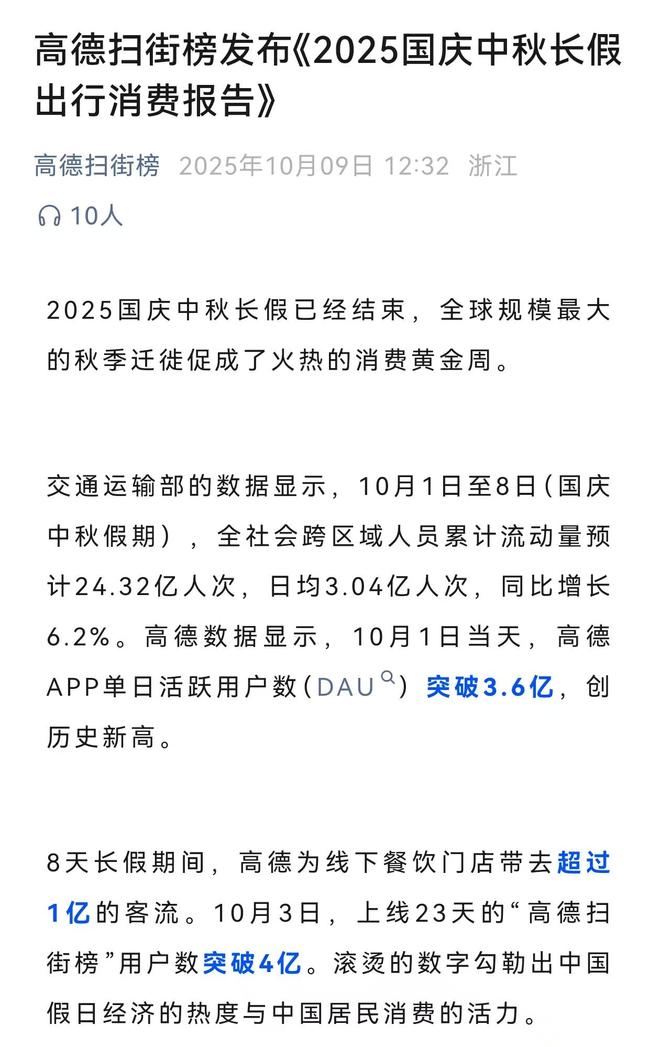 此前的9月10日,高德正式宣布,推出全球首個(gè)基于出行行為的榜單產(chǎn)品——高德掃街榜,全面進(jìn)軍本地生活市場。在上線23天后,“高德掃街榜”累計(jì)用戶數(shù)突破4億(截至10月3日);幾乎與此同時(shí),高德App在10月1日錄得突破3.6億的DAU(日活躍用戶),創(chuàng)下歷史新高。