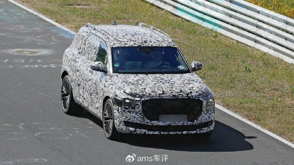 從首批曝光的實車圖來看,這款SUV前臉極具氣勢,配備了一個碩大的進氣格柵以及狹長的燈組設計。在發動機蓋正下方,可以看到細長的日間行車燈條,而頭燈隱藏在偽裝之下,分布在格柵兩側。格柵下方的前包圍則進一步拉伸了整車的視覺寬度,使車頭更顯厚重與穩健。發動機蓋線條起伏有致,輪拱寬大而有肌肉感。