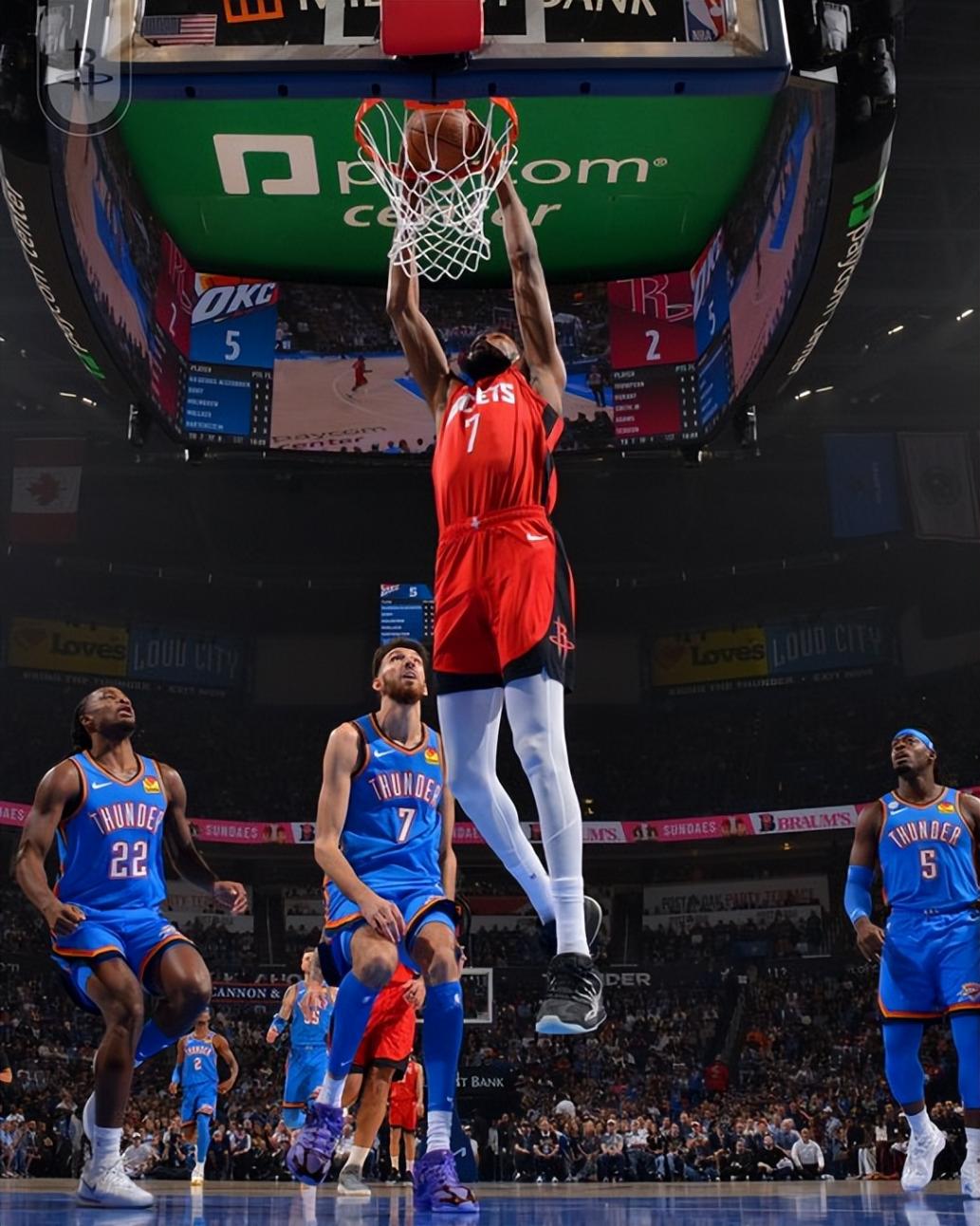 進入到比賽當中,杜蘭特借助申京搶斷亞歷山大后的妙傳,用一次快攻雙手暴扣貢獻他火箭生涯首球。杜蘭特隨后接連用標志性干拔中投得分,還一度補防大帽亞歷山大(并未記錄為蓋帽)。首節比賽杜蘭特打滿12分鐘,貢獻8中3得到8分1籃板。