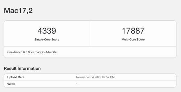 從常規(guī)性能的角度來看,M5芯片只能算作蘋果生態(tài)內(nèi)的一次穩(wěn)步迭代。在MacBook Pro中,這顆芯片獲得了單核心4339、多核心17787的成績,這一成績相比上一代M4芯片有一定程度的提升。
