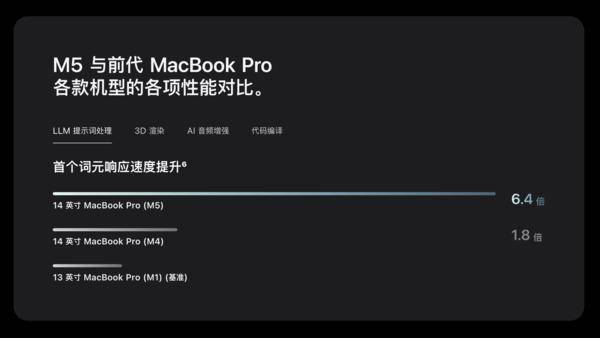蘋果官方宣稱,M5芯片的圖形處理器在AI峰值計(jì)算性能上較M4提升4倍以上,尤其是“LLM提示詞處理”,其首個(gè)詞元響應(yīng)速度更是顯著提升。