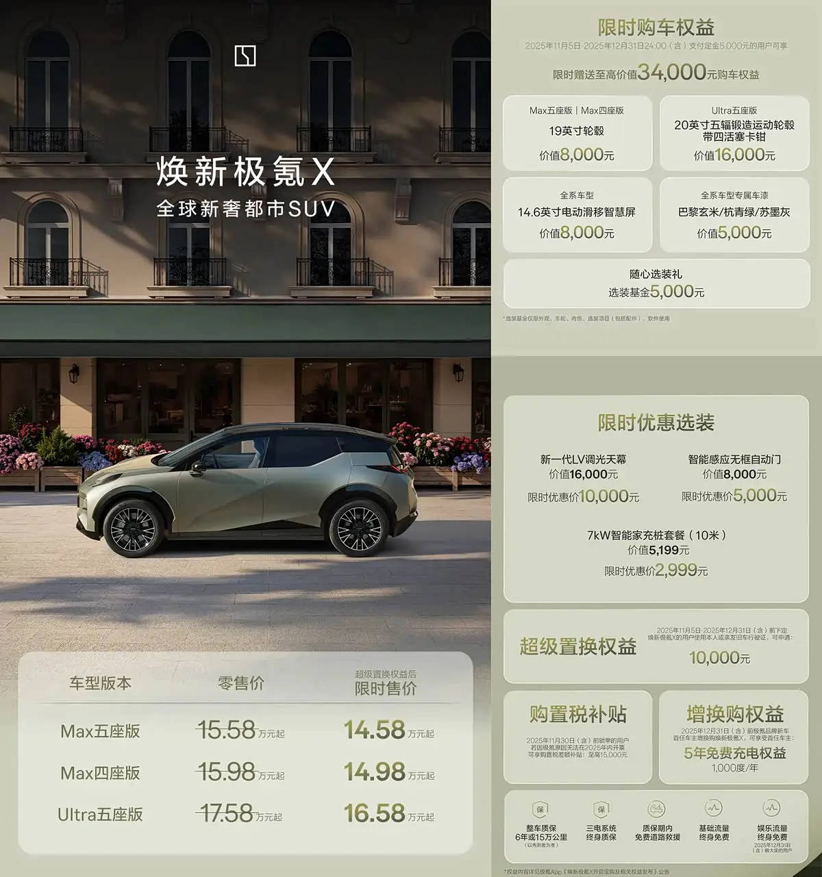 11月5日,我們從極氪品牌官方了解到,旗下緊湊型SUV—新款極氪X正式上市,共推出3款配置,售價區間為15.58-17.58萬元,超級置換權益后限時售價區間為14.58-16.58萬元。同時,從即日起至12月31日24:00(含)支付定金5000元用戶可享限時贈送至高價值34000元購車權益,包含5000元選裝基金等。