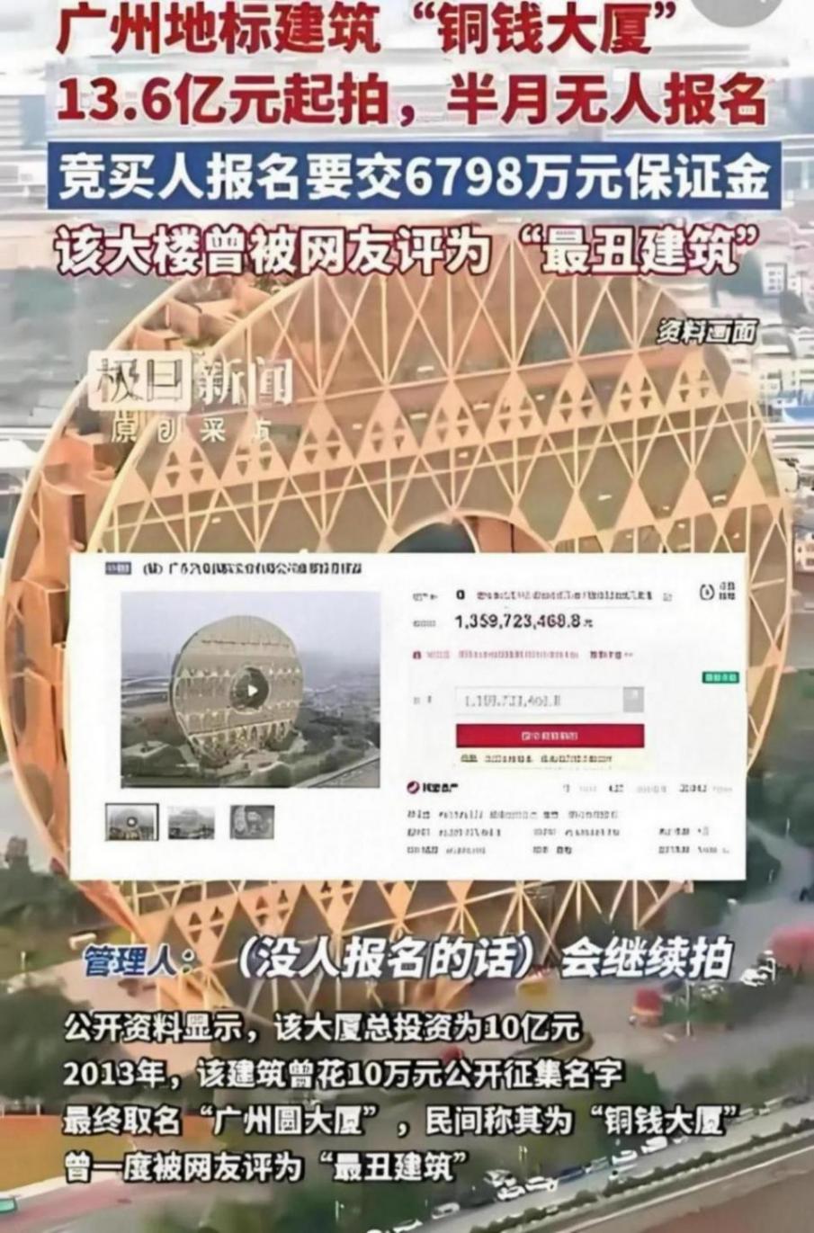 今年10月底,廣州圓大廈開啟拍賣程序,起拍價為13.6億元。這座曾被評為“最丑建筑”的標志性建筑,如今在拍賣市場遭遇波瀾。