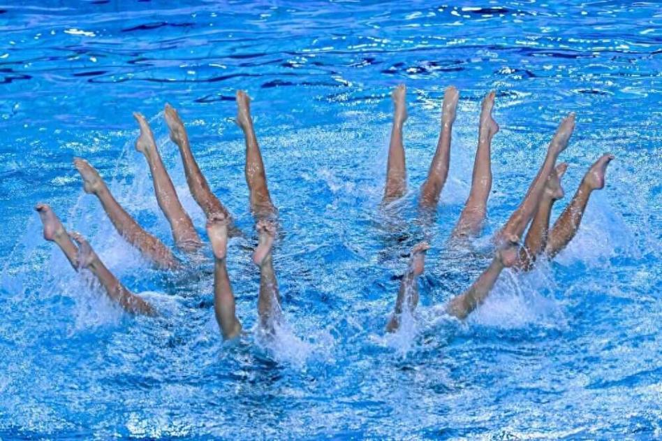 13日,第十五屆全國運動會花樣游泳決賽在廣東省江門市展開角逐。碧藍泳池中,妝容精致、泳衣亮眼的姑娘們魚貫入水,跟隨音樂節(jié)奏精準做出托舉、空翻等動作。當8名隊員水中倒立、16條腿在空中齊齊劃出弧線時,觀眾掌聲不斷。