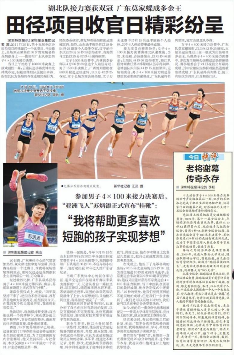 值得一提的是,今年9月26日在山東日照舉行的2025年全國田徑冠軍賽男子4×100米預賽中,蘇炳添帶領廣東隊跑出38秒60,不僅奪得小組第一,更打破沉寂12年之久的廣東省紀錄。