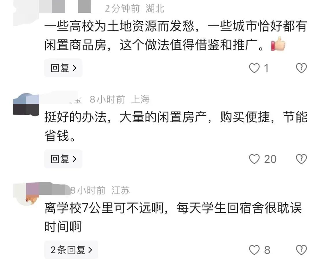 針對此事,有網(wǎng)友表示,一些高校為土地資源而發(fā)愁,一些城市恰好都有閑置商品房,這個做法值得借鑒和推廣。