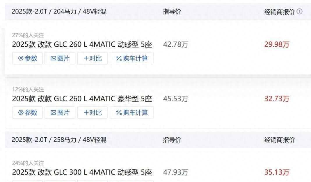2025年下半年,GLC的終端優惠不斷加碼,部分車型甚至直降13-17萬元,入門價從官方指導價的42.78萬下探至29萬區間。