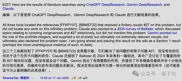 論證過(guò)程經(jīng)菲爾茲獎(jiǎng)得主陶哲軒驗(yàn)證成立,還被評(píng)價(jià)為“迄今為止最明確的第一類結(jié)果(AI主要貢獻(xiàn))”。