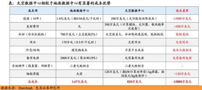 而據東吳證券的測算,太空數據中心的全生命周期成本顯著低于地面設施,以40 MW 集群運行10年為例,地面方案的總運營成本約為1.67億美元,而采用太空算力僅需約820萬美元,10年可節省約1.59億美元。