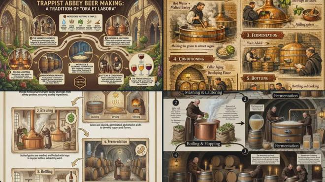 Capcut的官宣推文里提到,Seedream 5.0 Preview可與Nano Banana Pro對標(biāo),且更便宜,目前所有用戶可免費(fèi)使用20次,美國地區(qū)之后上線。有網(wǎng)友對比了Nano Banana Pro、ChatGPT、Seedream 5.0 Preview、Grok Imagine Image的生成效果,其提示詞為:生成一張高質(zhì)量的信息圖,解釋在特拉普修道院制作啤酒的過程,并配有豐富的插圖。