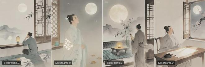 第一個(gè)提示詞是“為《靜夜思》生成古詩插圖”,可以看到生成的結(jié)果中人物“舉頭望明月”這一關(guān)鍵元素都沒有缺失,還附上了人物在月光下的影子等,但原詩中的“床前”等沒有在圖片中涉及到。