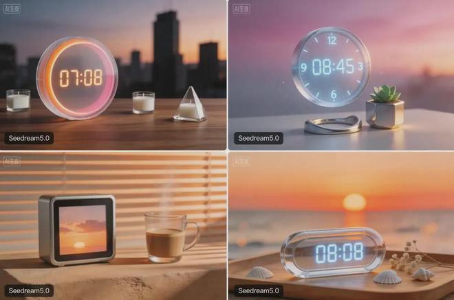 還有抽象的提示詞,智東西輸入“生成一個(gè)靜謐科技感且?guī)в新淙沼鄷煼諊聂[鐘圖片”,新模型生成的圖片中,從鬧鐘的設(shè)計(jì)到背景將落日、科技感融合在了一起。