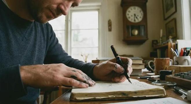 Nano Banana Pro生成的圖片中,人物握筆的手為左手,可以從模糊的時(shí)鐘看出其時(shí)間為5:30左右。