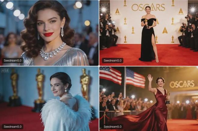 當(dāng)智東西的提示詞為“最新奧斯卡獲獎?wù)呒t毯風(fēng)格”時(shí),Seedream 5.0 Preview可以直接生成有紅毯、背景板、攝影師的完整圖像,背景板還有不少奧斯卡的小金人。