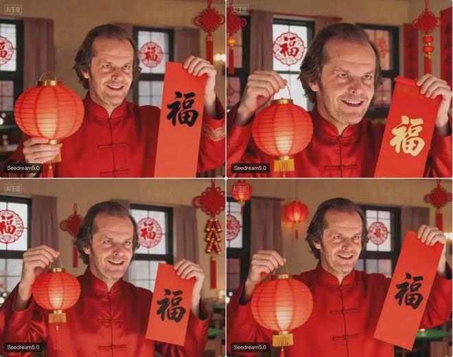 根據(jù)參考圖生成圖片方面,智東西上傳了最近熱度超高的《閃靈》男主杰克,并讓Seedream 5.0 Preview“生成這個(gè)人的拜年圖片,主人公要身有年味的服裝,手拿燈籠和對聯(lián)”。